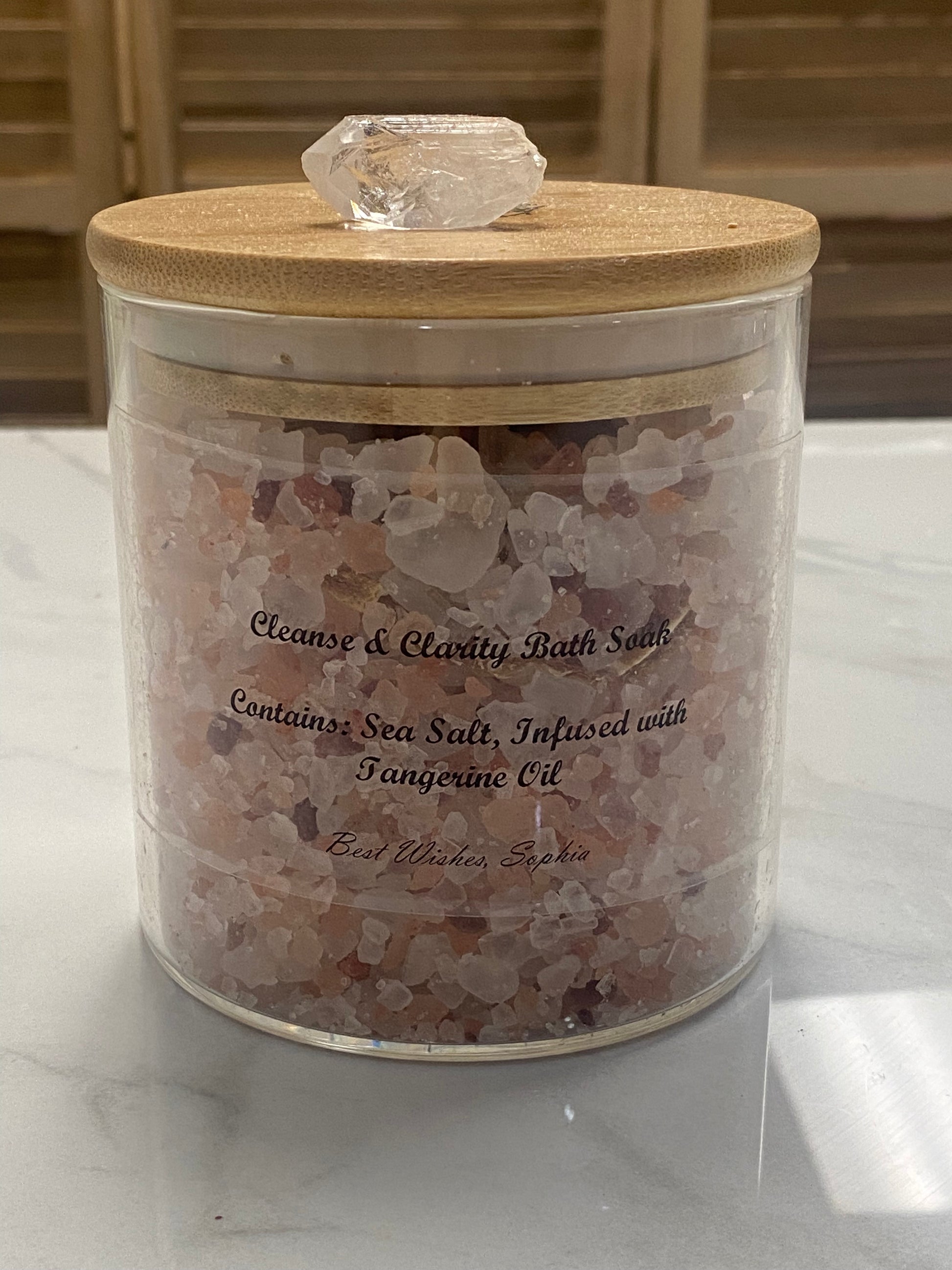 Our luxurious, handcrafted Cleanse and Clarity Bath Soak is made with all-natural ingredients. Our handcrafted blend includes a Clear Quartz also known as the Master Crystal, with your purchase.