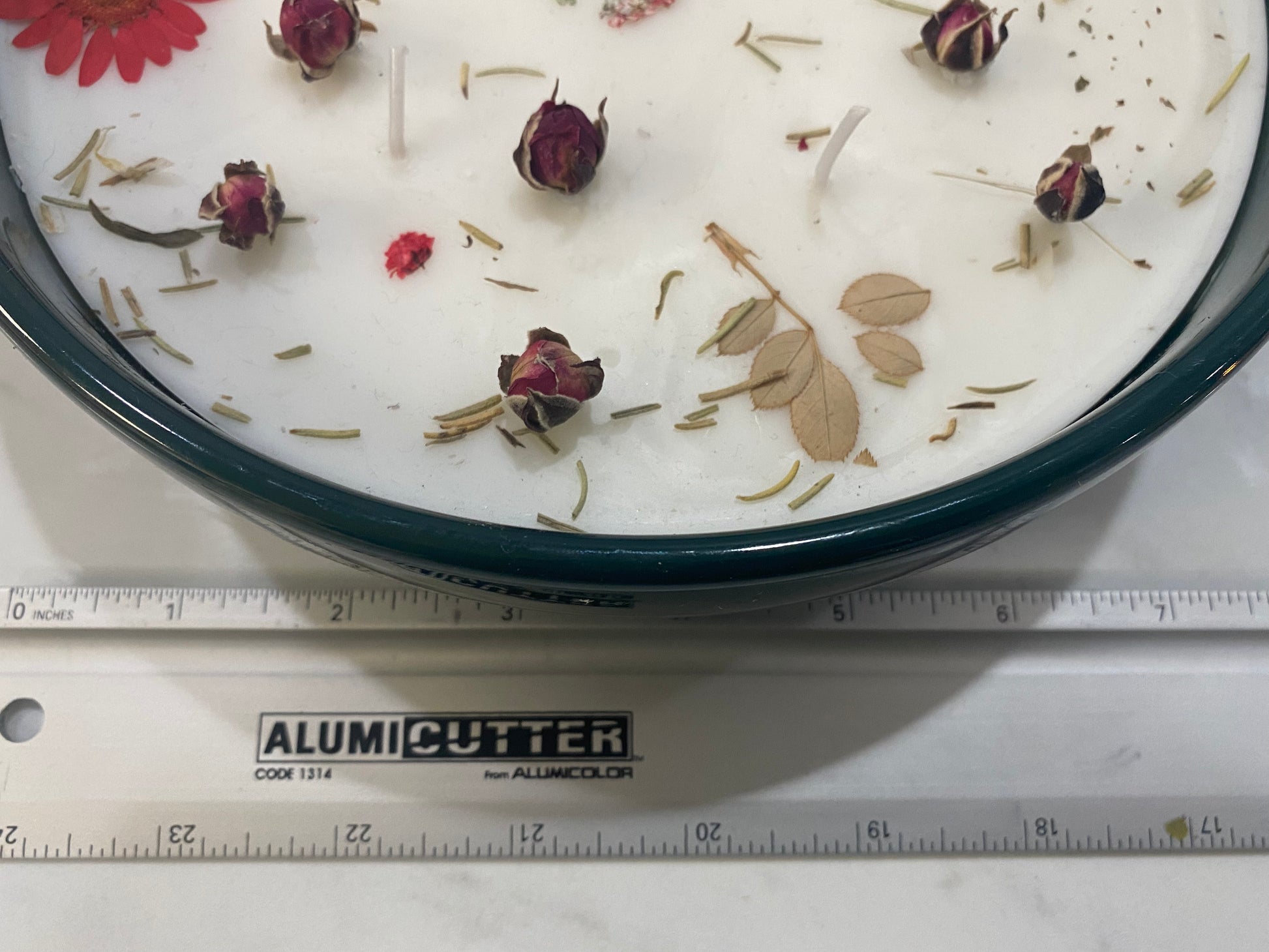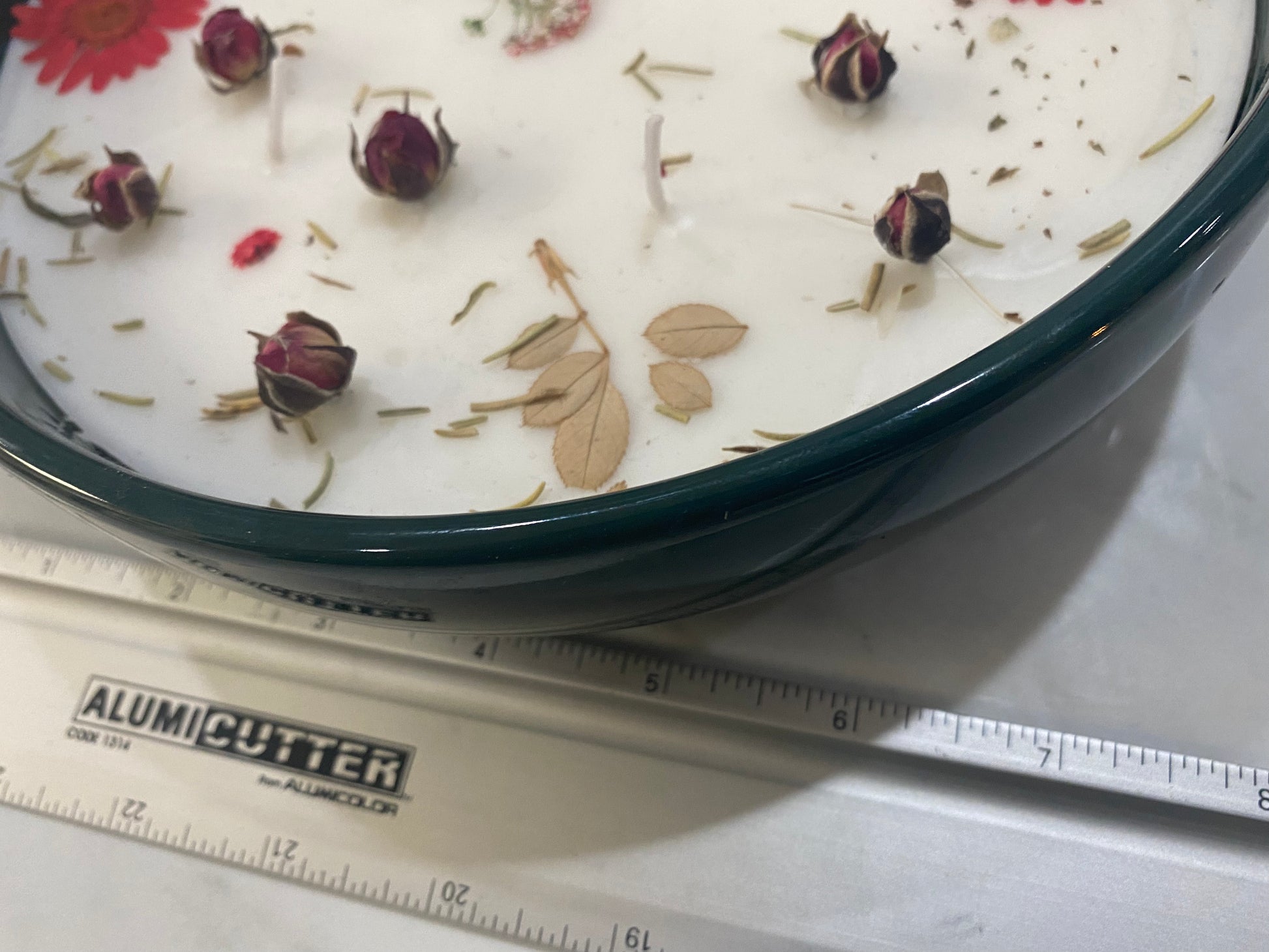 Large candle in circular ceramic bowl. Rose scented and adorned with dried flowers