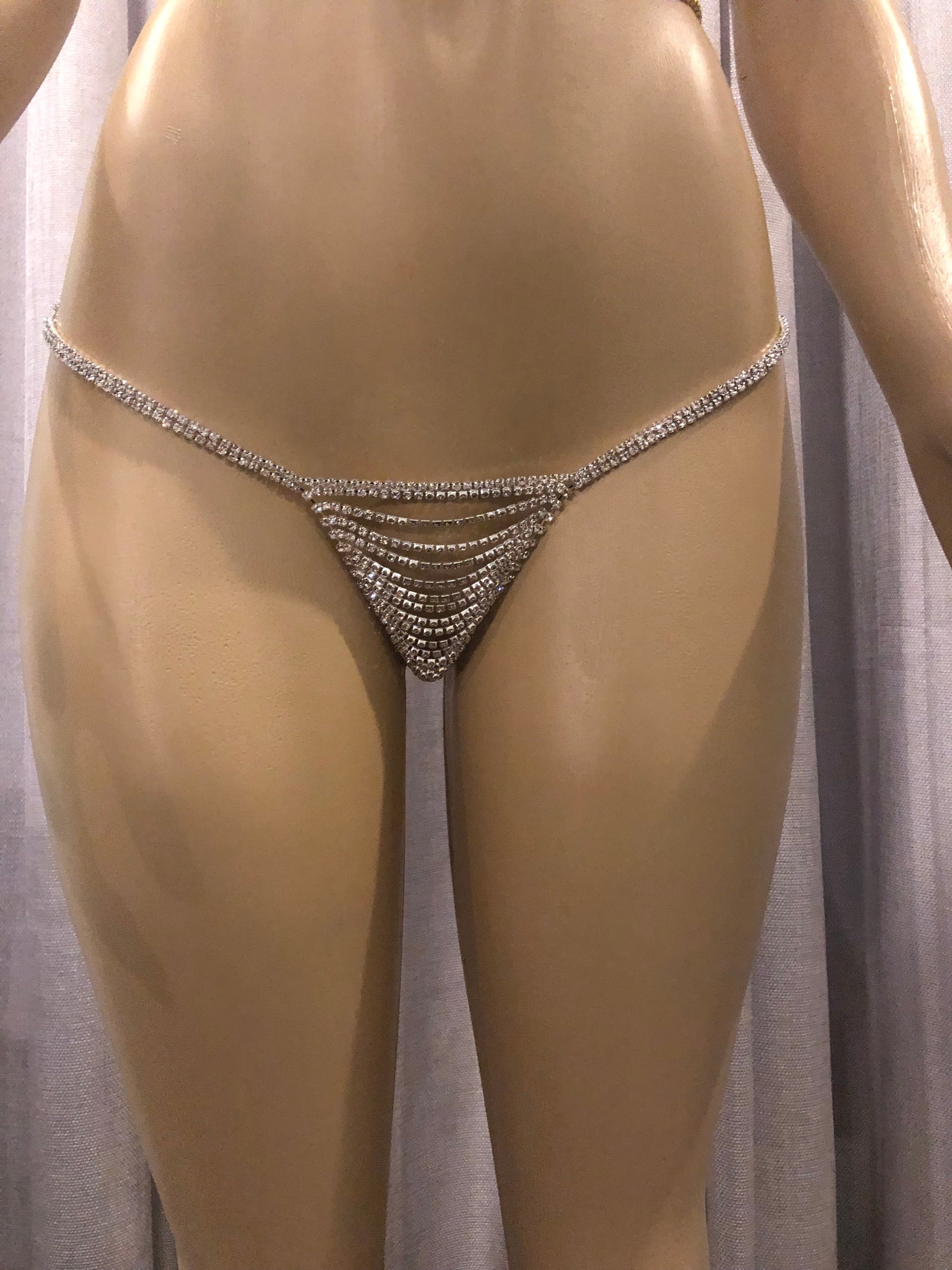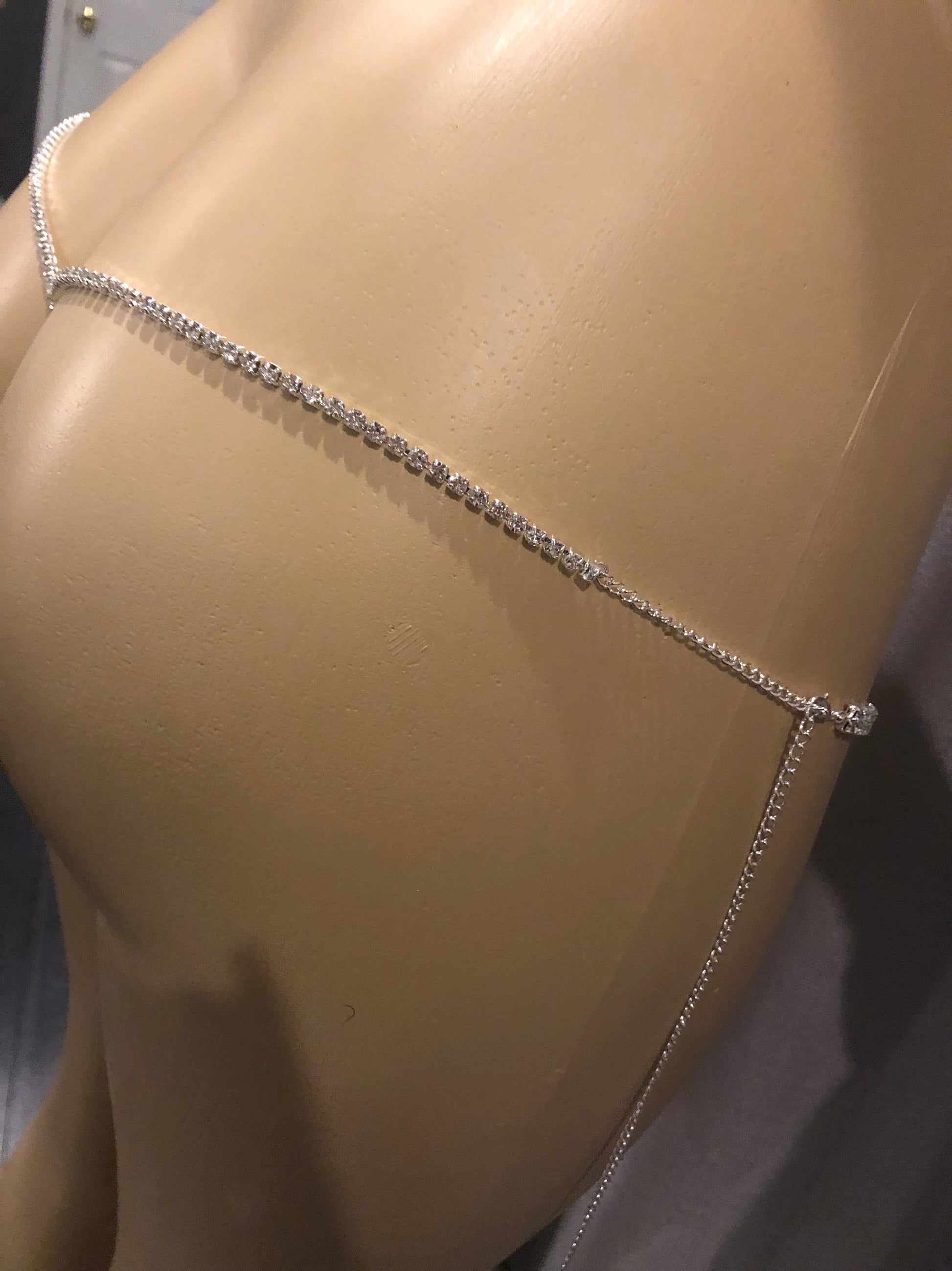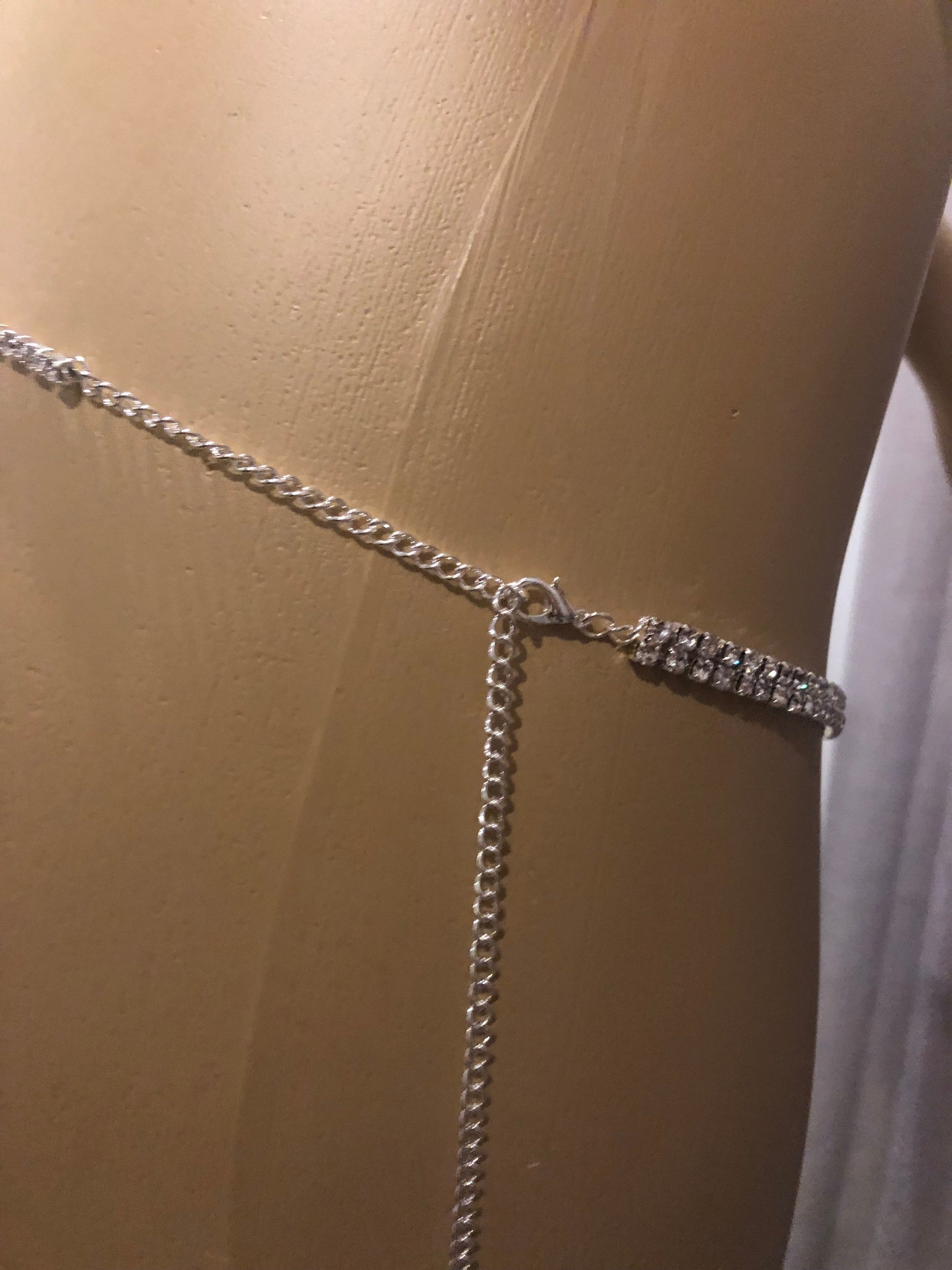 Features adjustable chains with clasps for individual fit around waist. You can wear with or without traditional lingerie. Sexy body jewelry to adorn yourself in the bedroom or onstage. This unique design will set you apart and take any lingerie to the next level of glam. Surprise the blushing bride to be with this exotic design she will soon not forget! Each stone is set in a prong setting with t-hook connectors. Chain will drape on your body in a loose fit including chain that goes between legs. Clear stones set in rhodium plating that is nickel and lead free.