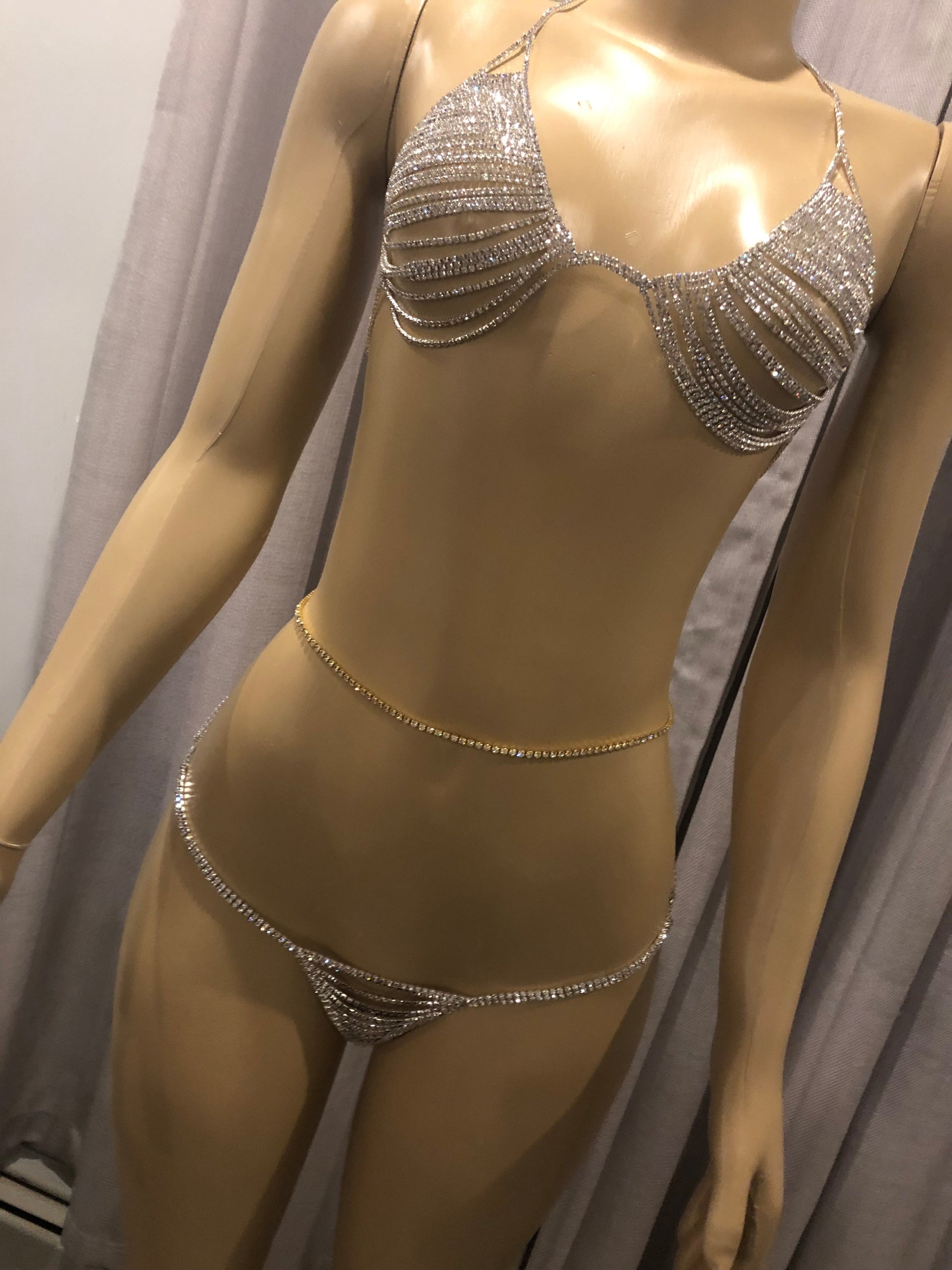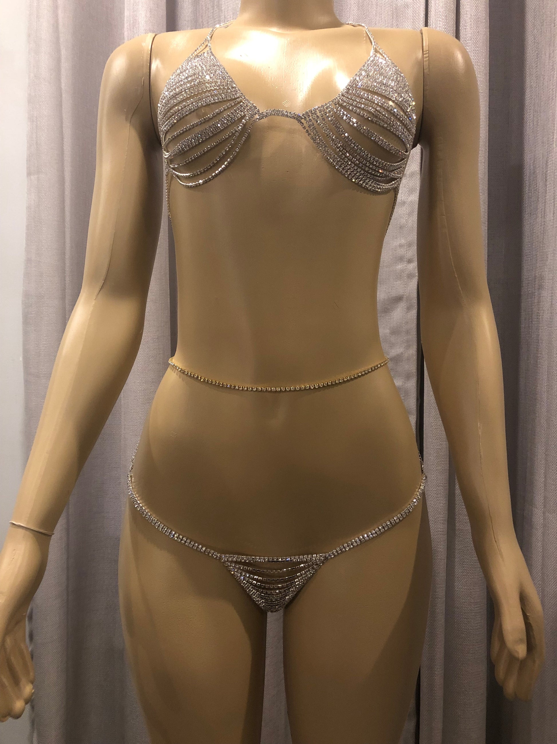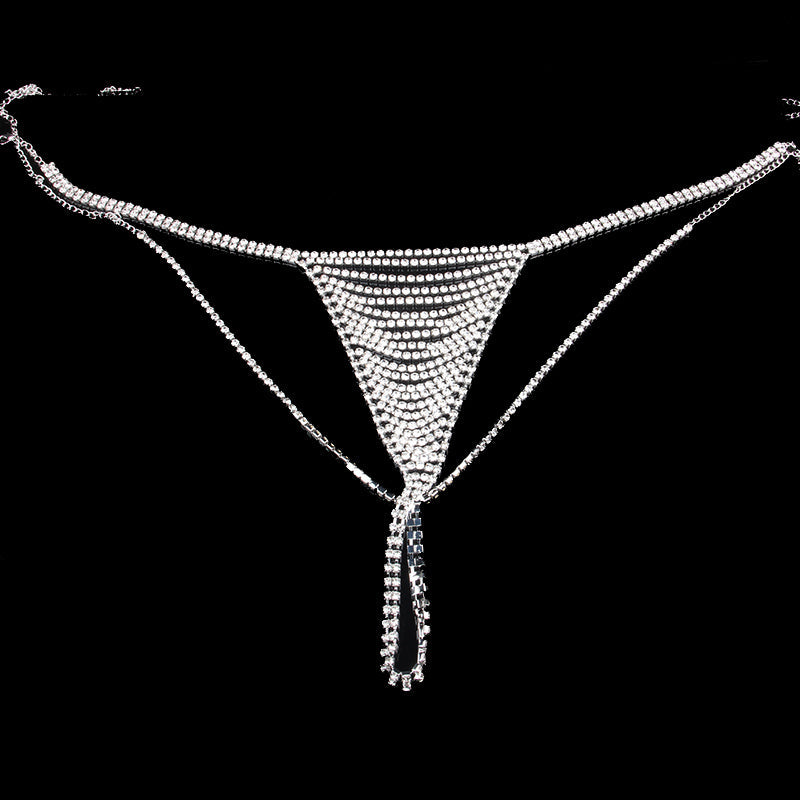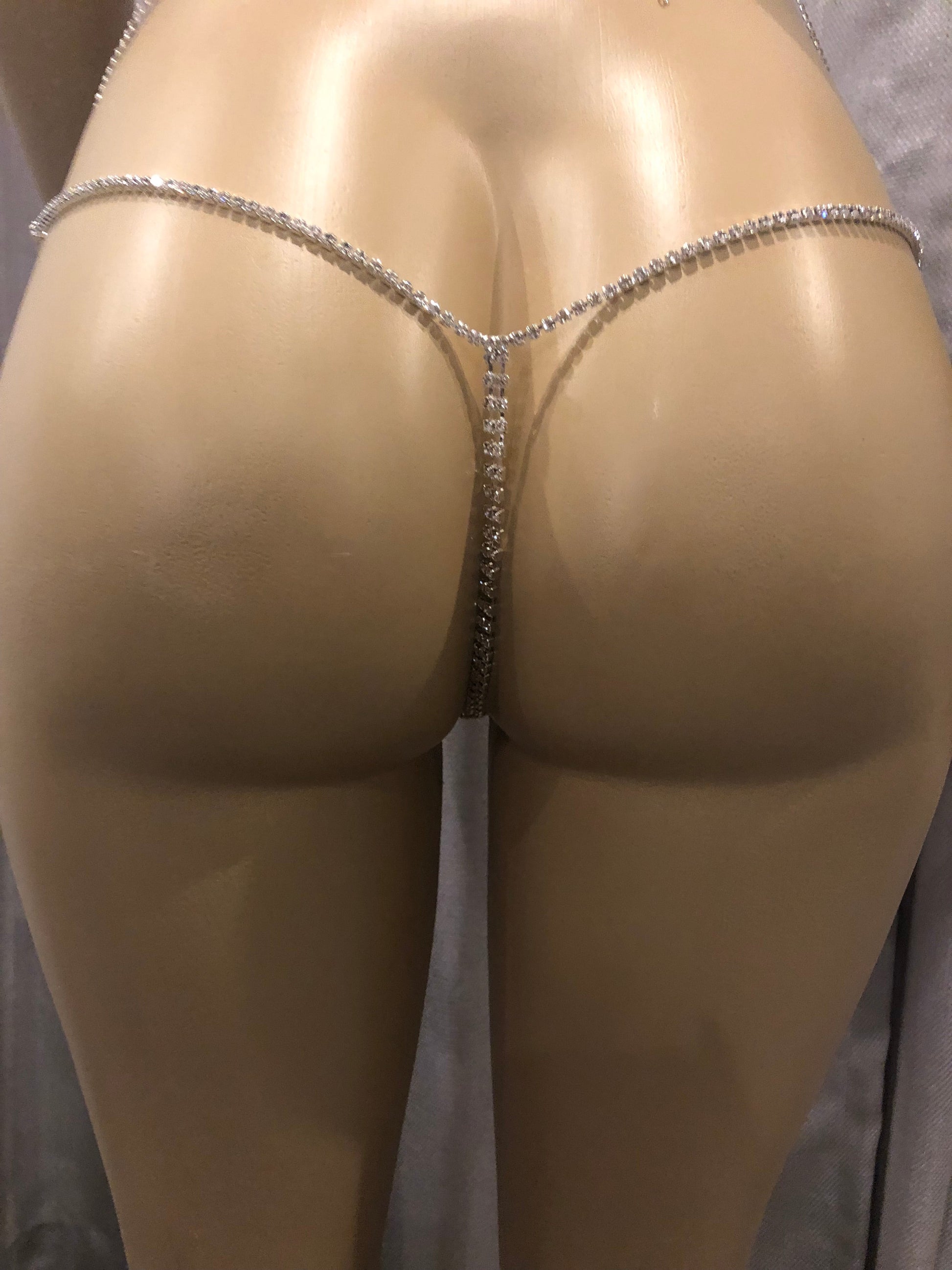Features adjustable chains with clasps for individual fit around waist. You can wear with or without traditional lingerie. Sexy body jewelry to adorn yourself in the bedroom or onstage. This unique design will set you apart and take any lingerie to the next level of glam. Surprise the blushing bride to be with this exotic design she will soon not forget! Each stone is set in a prong setting with t-hook connectors. Chain will drape on your body in a loose fit including chain that goes between legs. Clear stones set in rhodium plating that is nickel and lead free.