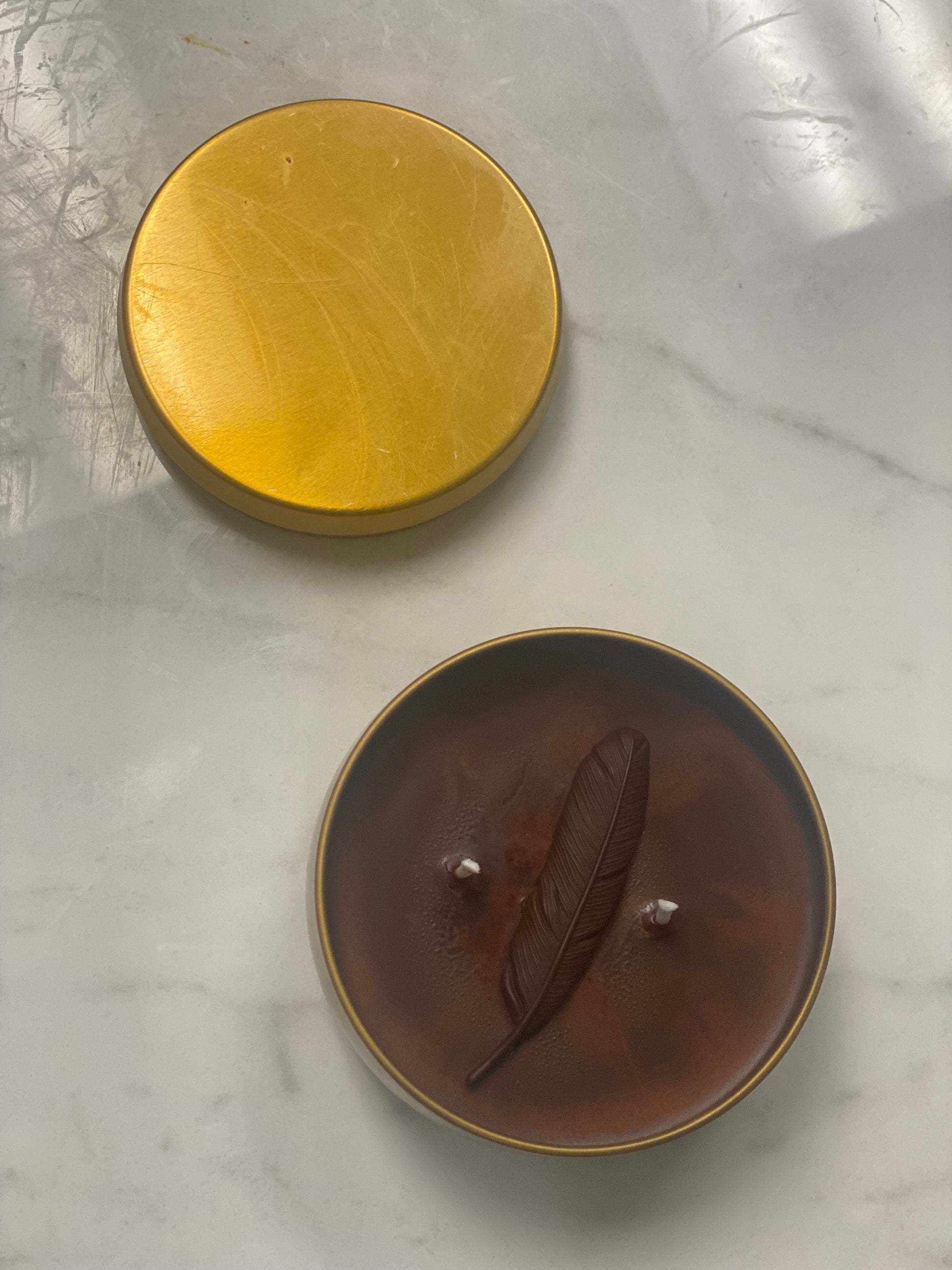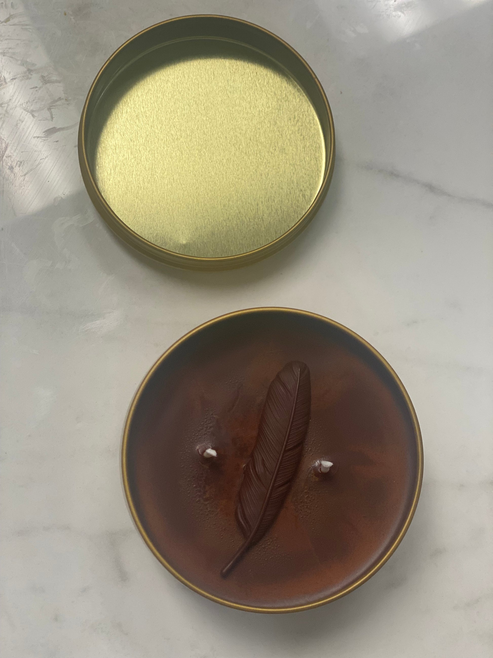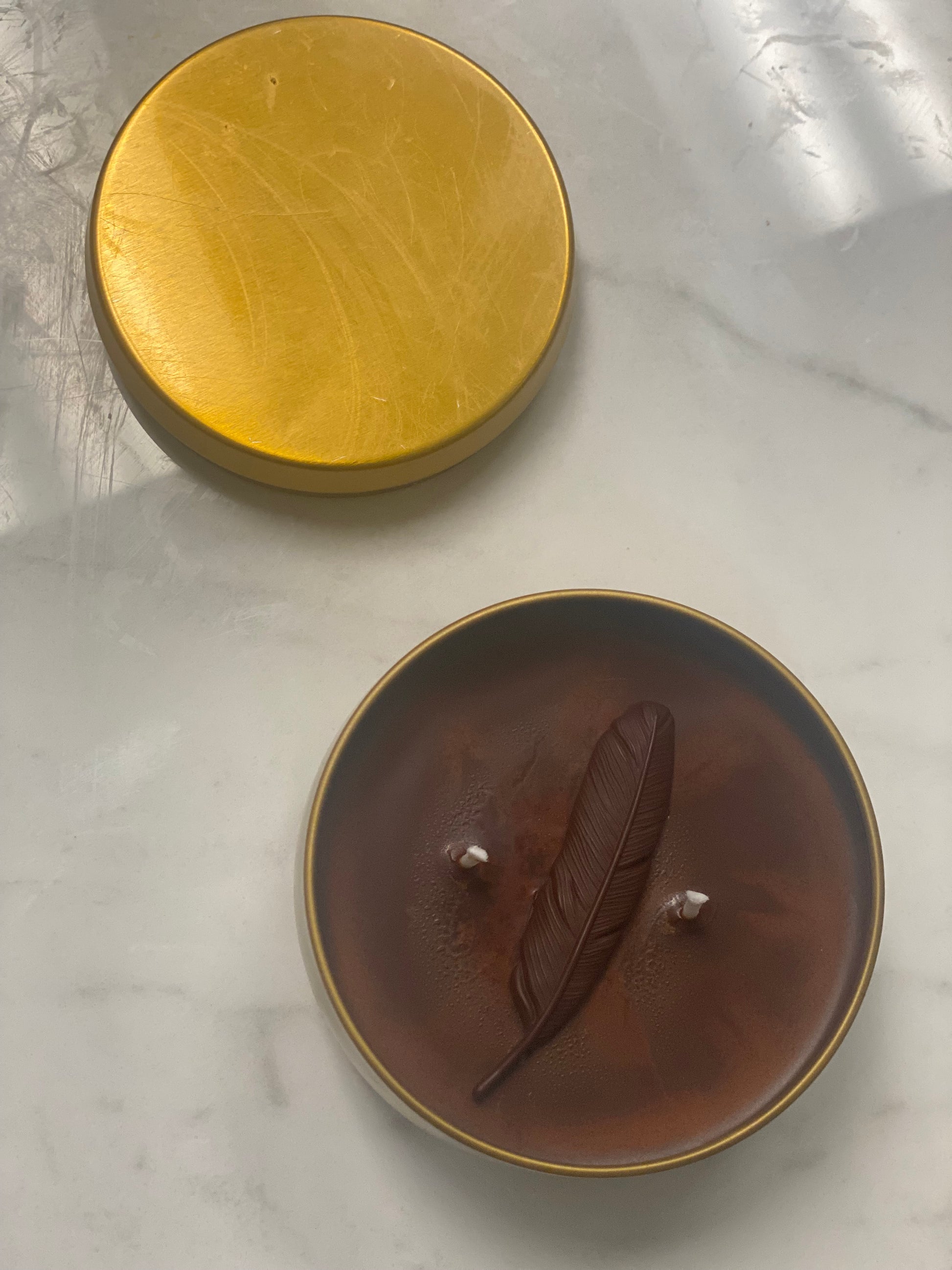 Made of 100% organic soy and high quality scent and wicks. Cocoa Scent. Keepsake tin with cover.