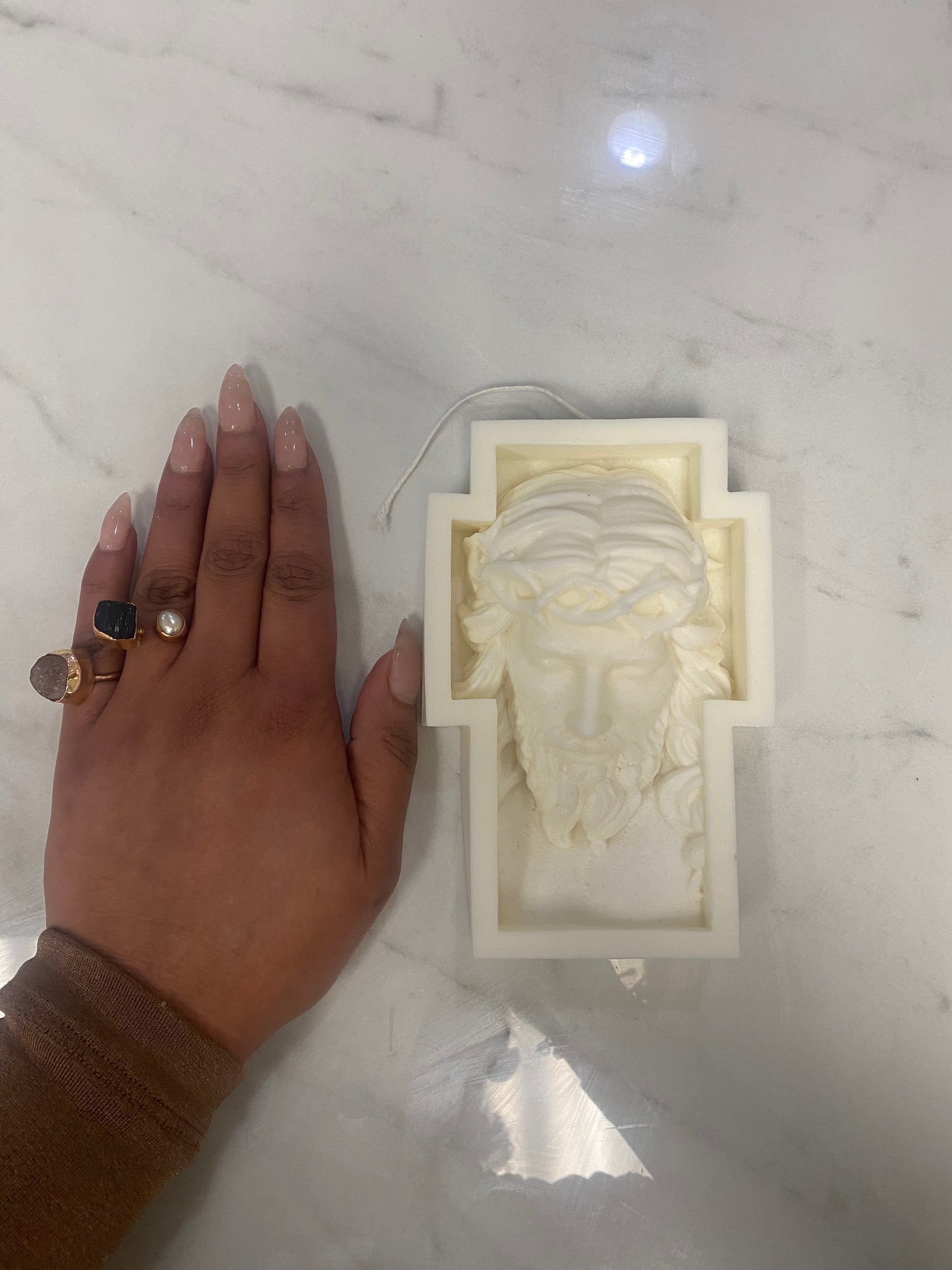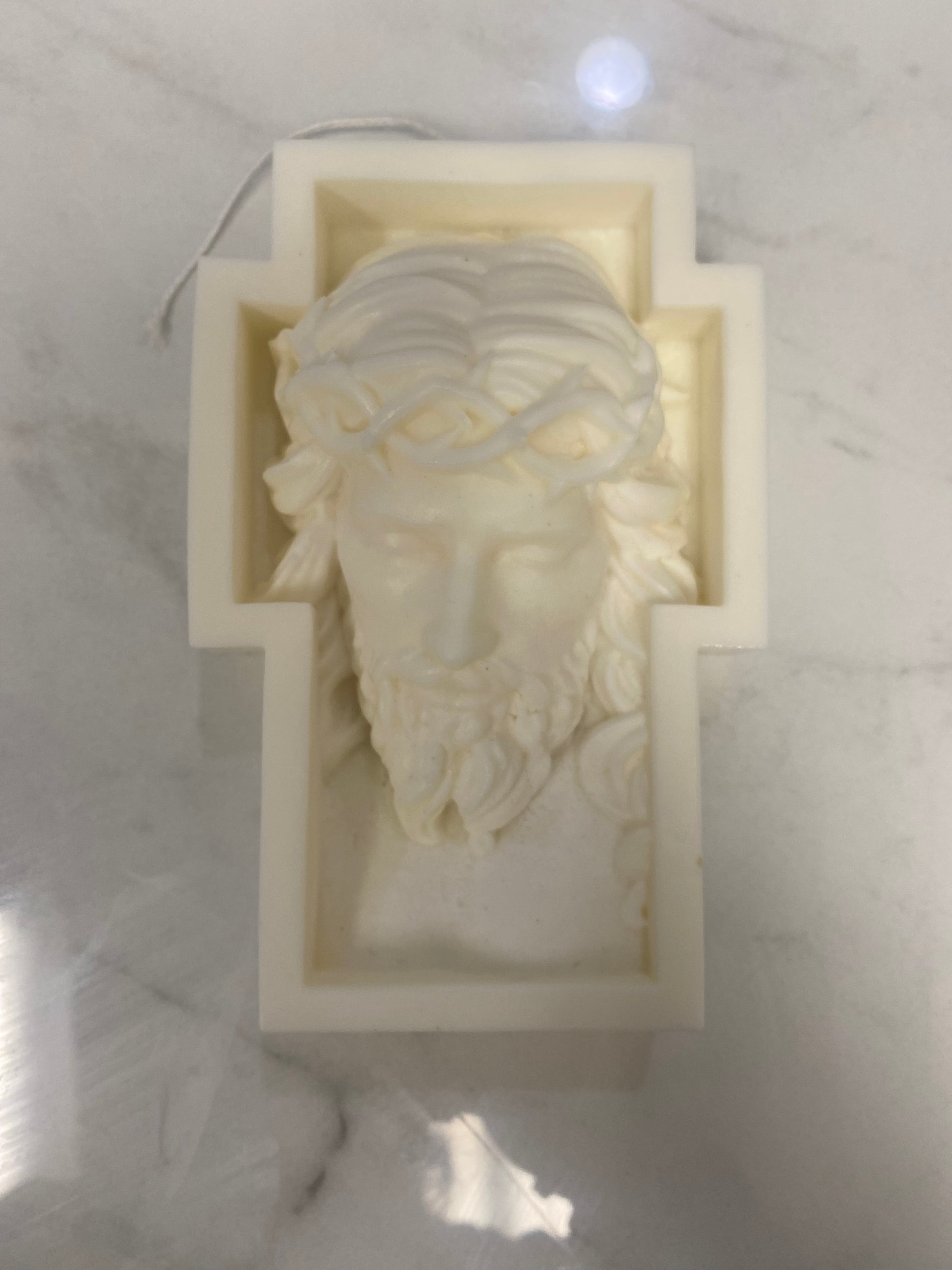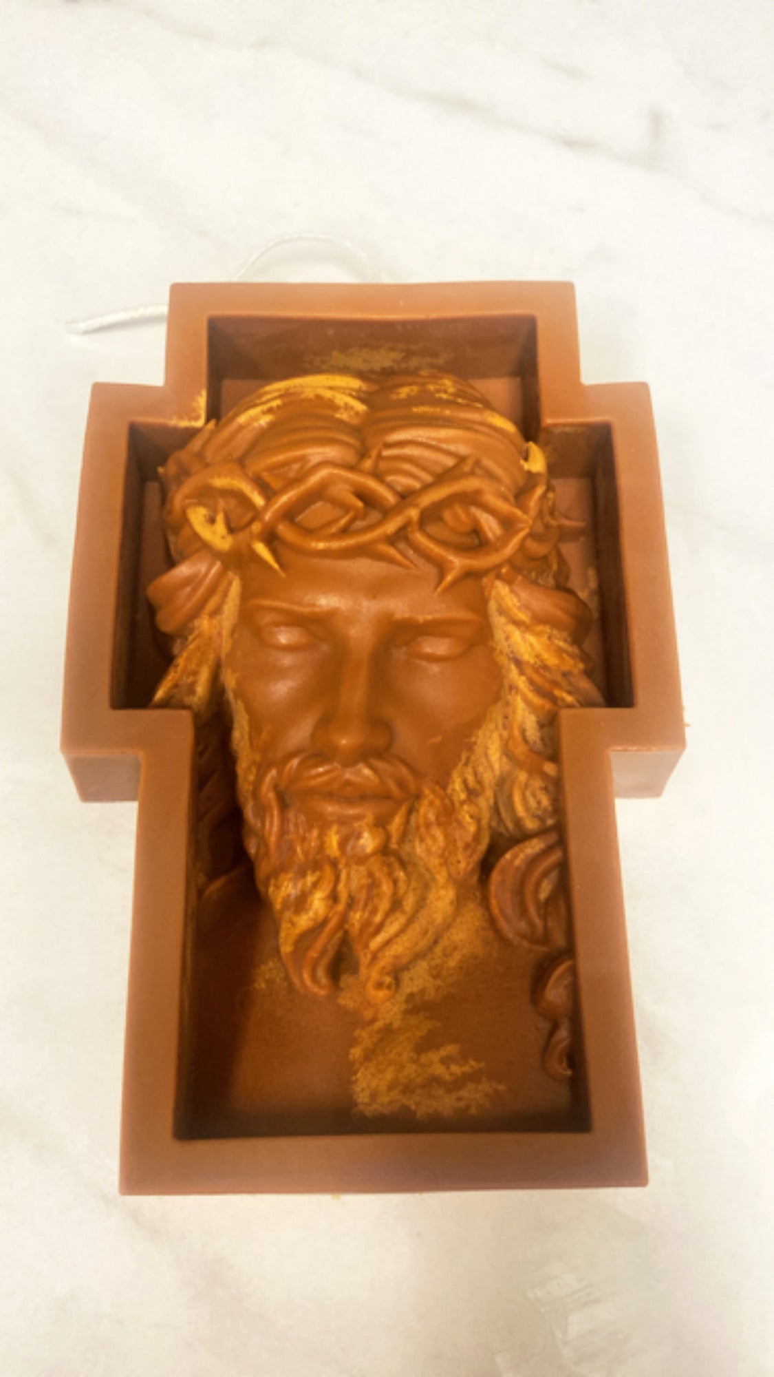 A beautiful handcrafted candle depicting Jesus on the Cross
