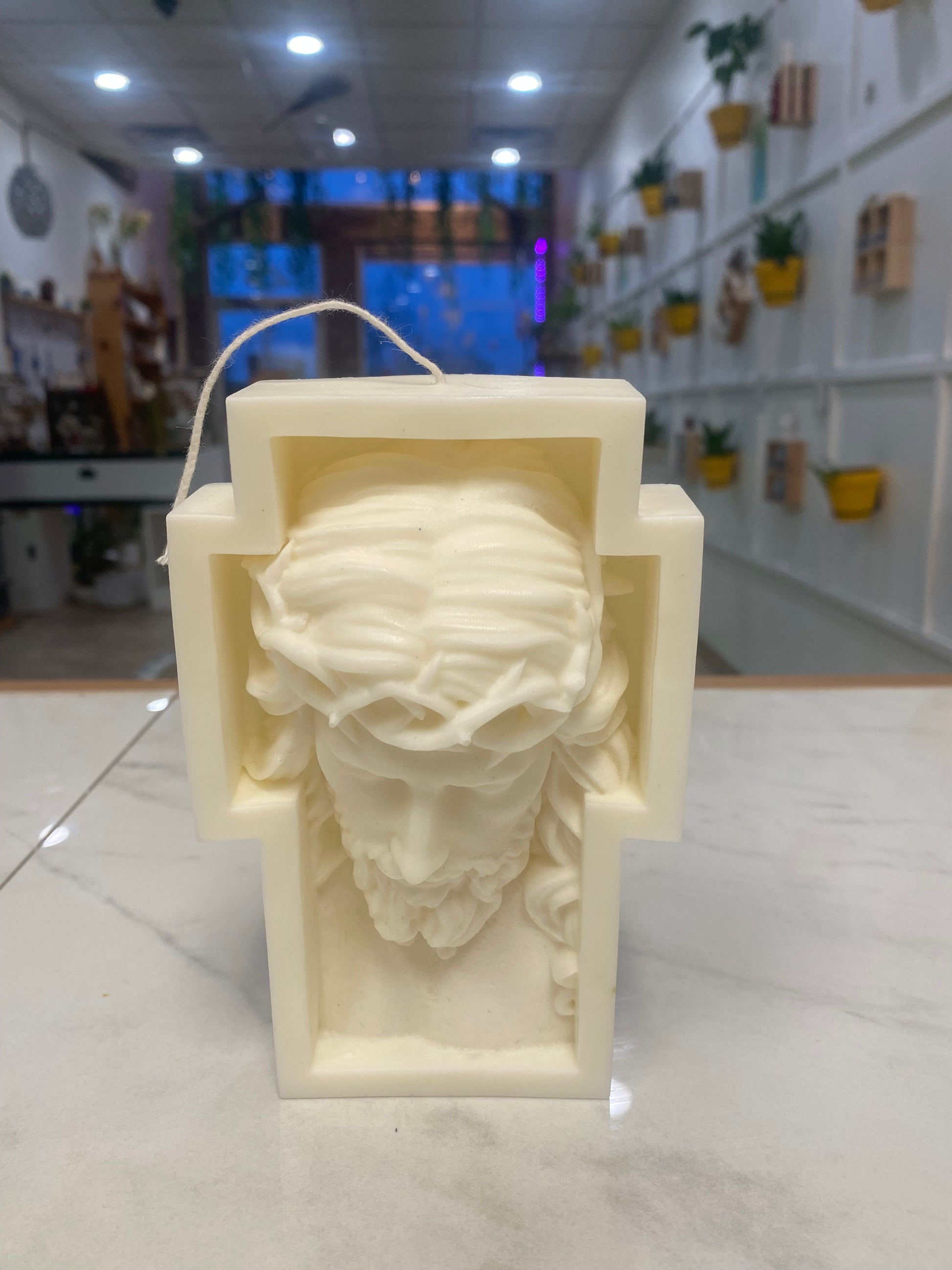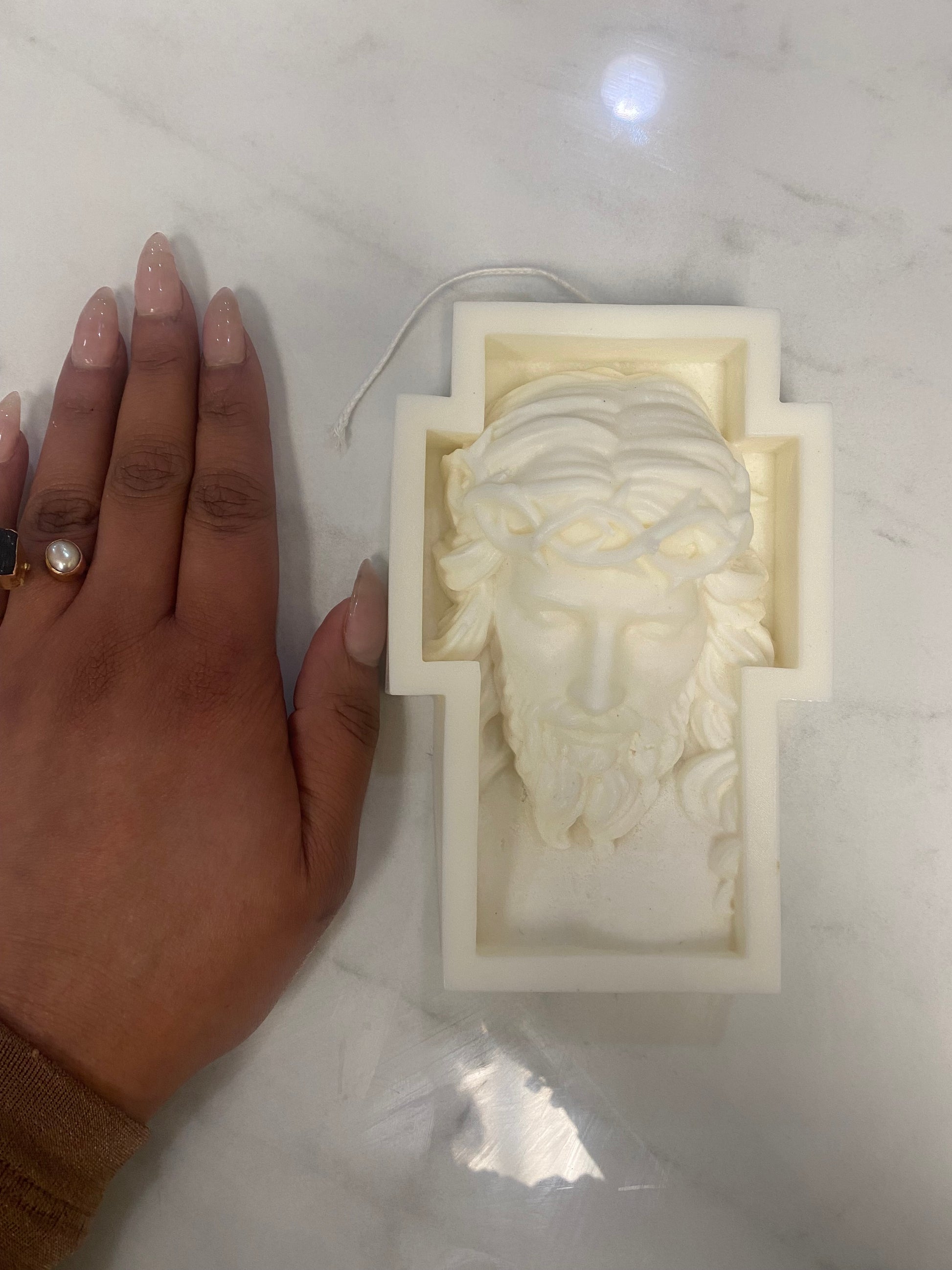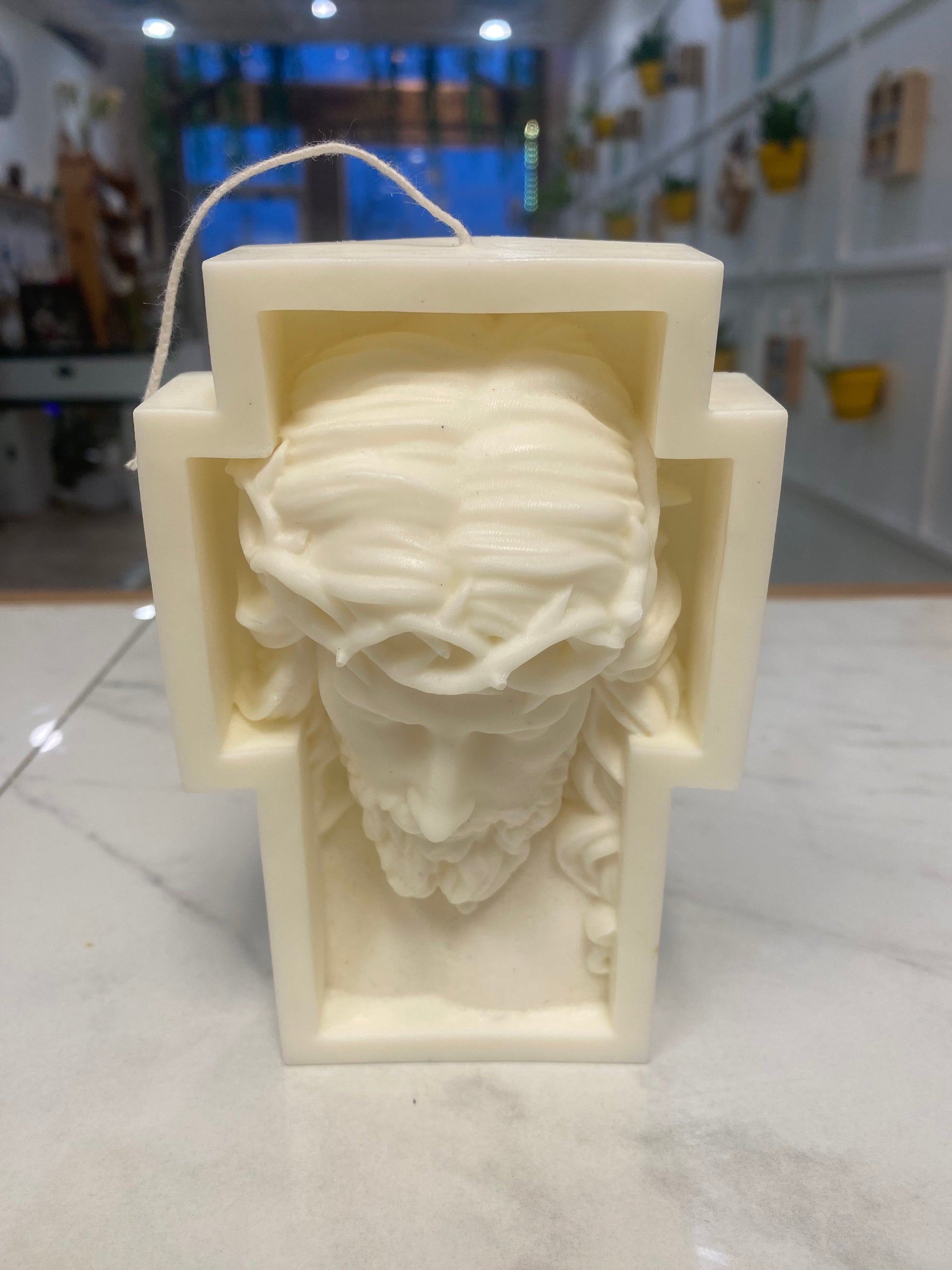 A beautiful handcrafted candle depicting Jesus on the Cross