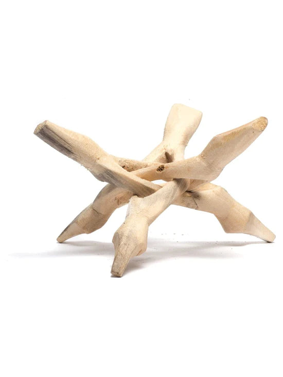 Hand made wooden cobra tripod stand. Use this for holding crystal balls or abalone shells. This wooden tripod is made from a single piece of wood, a wonderful piece of artistic talent. Colors range and vary: light brown, tan, cream - brown, grey. 4 inch size. Crafted in India.
